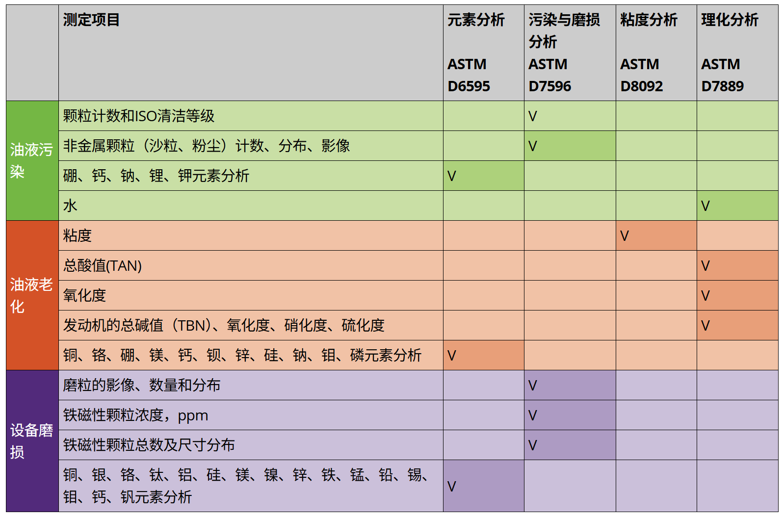 三向量是对润滑系统完整性和设备健康状况的简单表示。三向量可以表明每个向量(设备磨损、润滑油老化和润滑油污染)的健康程度。为了更好地掌握每个向量的状态,必须对油液的关键磨损、物理和化学参数进行检测。